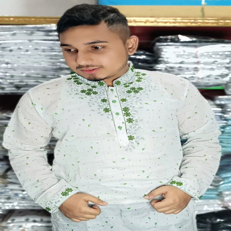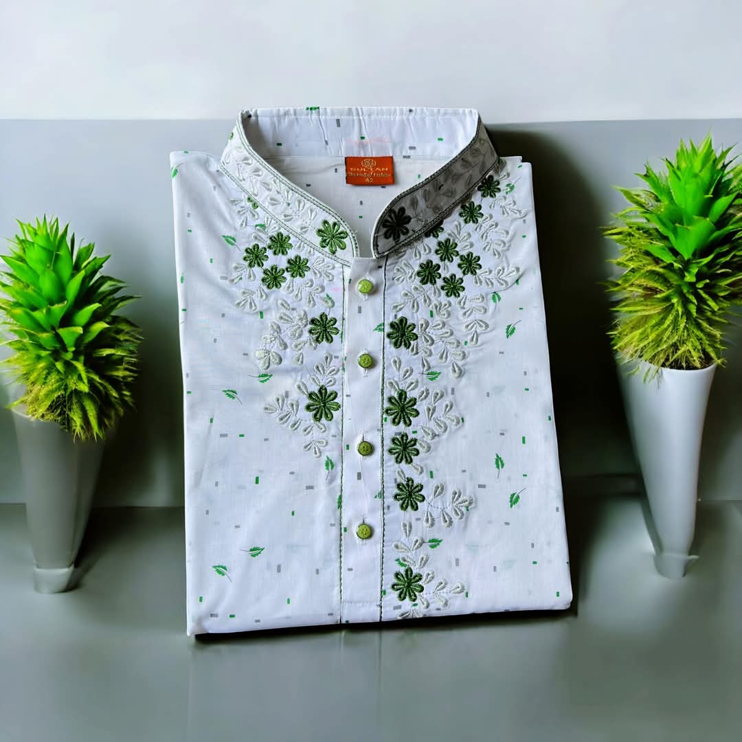 Adhi Dhuti Kaporer Embroidery Panjabi (Green Prints)