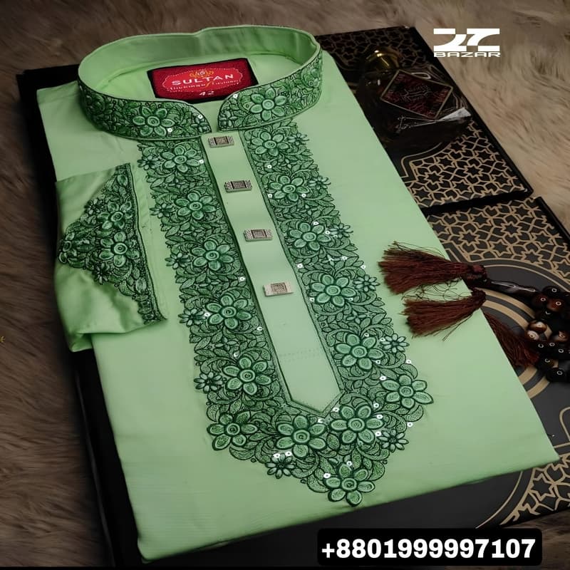 Adhi Dhuti Kaporer Embroidery Panjabi (Green Prints)